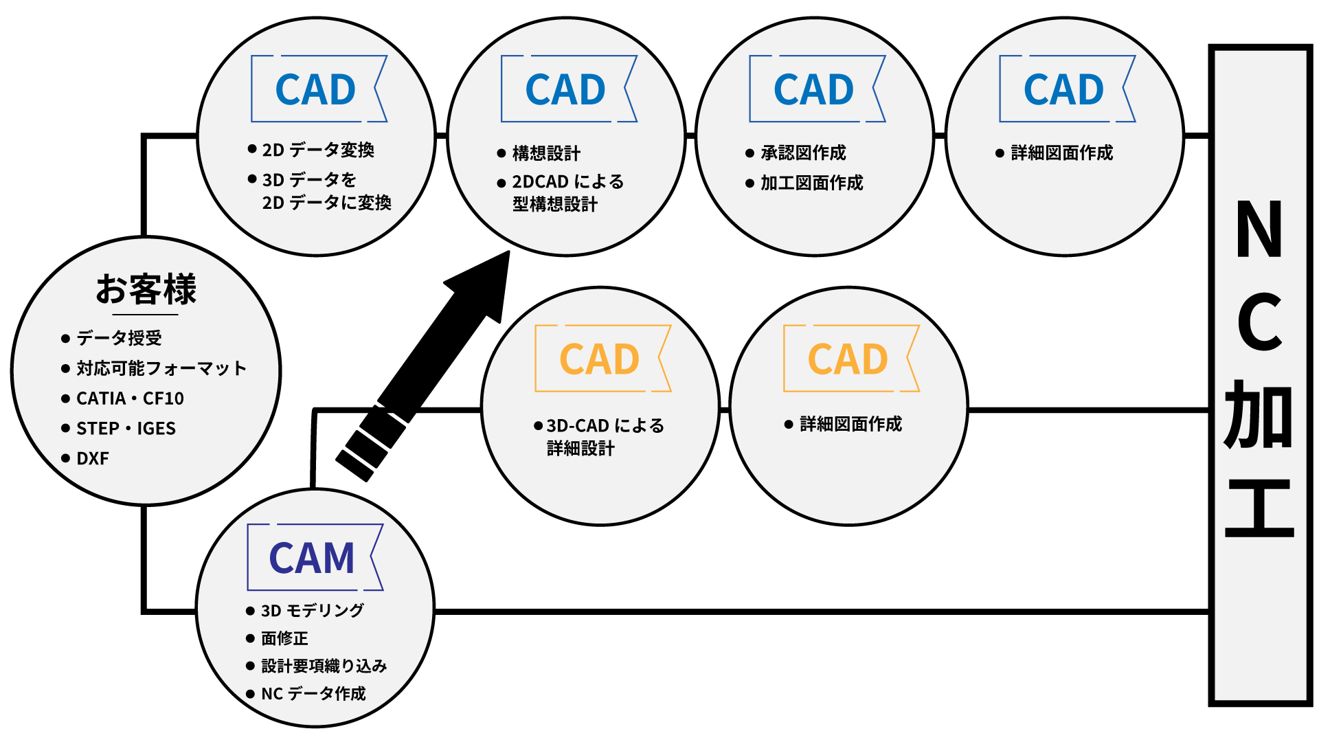 型設計の作業工程 設計では、お客様からの高度な要請にも対応・技術提案をできるスタッフを揃えております。また、常にお客様に満足していただける型を制作することを心がけております。 型設計の3パターン データ授受後、図面を作成して図面にて加工を行う場合 データ授受後、図面、3Dモデルを作成し加工を行う場合 データ授受後、3Dモデルを作成し加工を行う場合 Work flow 型設計 CAM 製品 CAM 製品 3D-CAD 詳細 3D-CAD 型設計